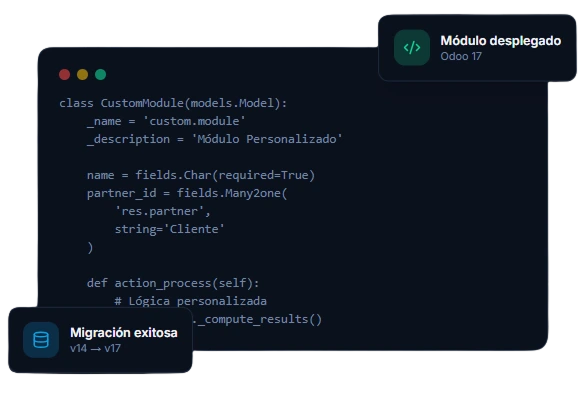 Creamos módulos personalizados, migramos versiones y resolvemos requerimientos técnicos en Odoo.